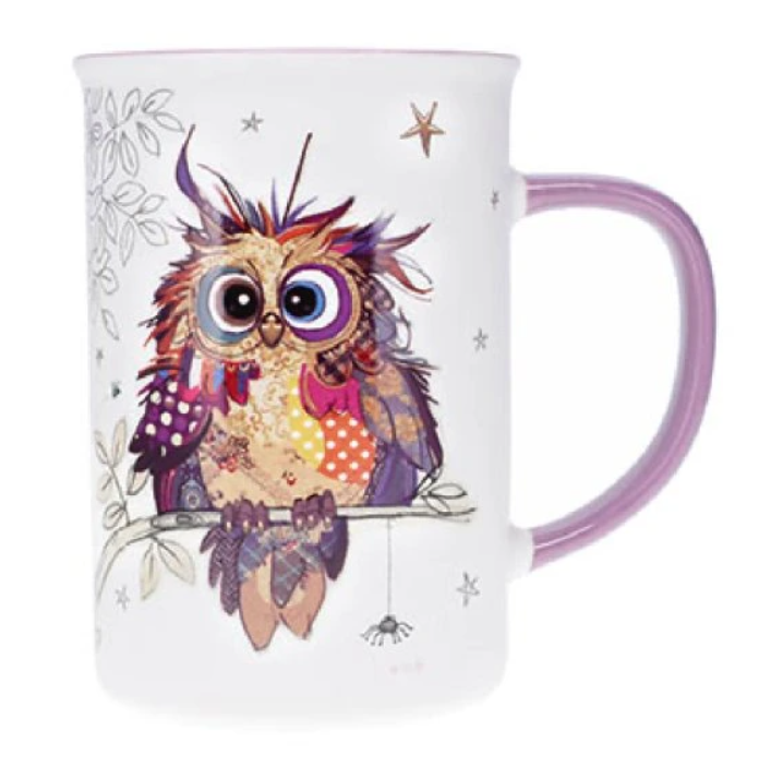 Nádherný porcelánový hrníček značky Bug Art Kooks s motivem veselé barevné rozčepýřené sovy. Značka se vyznačuje vysokou kvalitou a jedinečnými barevnými motivy inspirovanými zvířaty a přírodou.
