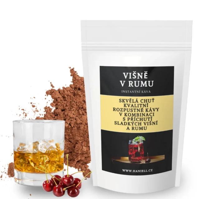 Představ si šálek kávy, který voní jako dezert a chutná jako malý večerní rituál. Rozpustná káva Višně v rumu spojuje plnou chuť kvalitní kávy s výrazným aroma vyzrálých višní a jemným dotekem rumu.
