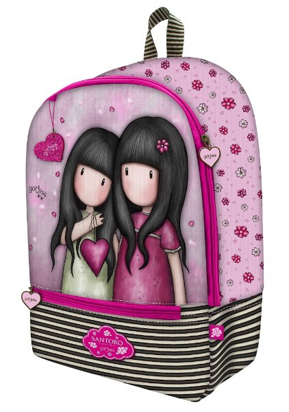 Tento školní batoh má celkem dvě komory, které mají pouze jeden hlavní prostor. Zadní komora má vyztužené dno, dvě našité kapsy např. na mobil a jednu kapsu na zip. Obě dvě komory se uzavírají na dvoucestný zip. Všechny zipy jsou ozdobeny přívěskem. Záda batohu jsou polstrovaná, stejně jako popruhy, které jsou nastavitelné. Na přední straně je ještě jedna kapsa uzavíratelná na zip. Panenka Gorjuss je vyobrazena na třpytivé látce.